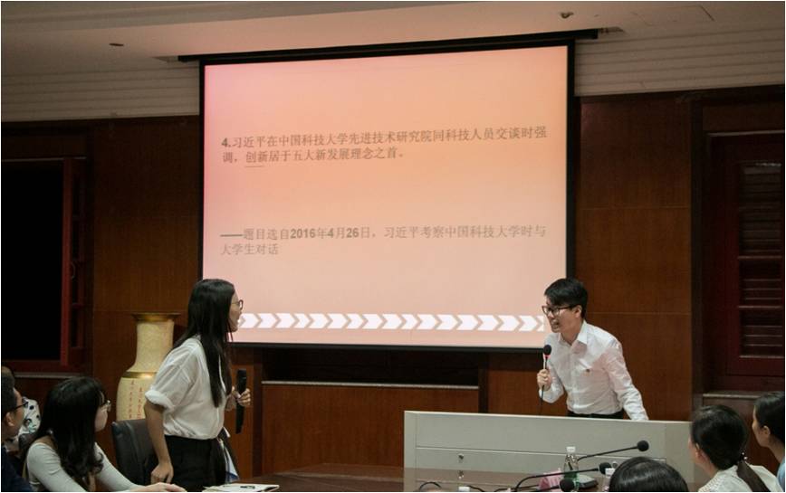 第二学习小组通过研读习近平总书记重要讲话篇目,归纳整理了讲话的核心内容,形成知识题库,以现场问答的形式深入开展学习。题库涉及习近平总书记系列重要讲话中关于治国理政新理念新思想新战略,以及与青年学生密切相关的要求和嘱托等各个方面内容。问答过程中,党员同学不仅准确答出知识点,还就题目畅谈个人的理解与感悟,以生动的形式为参会的党员同志们上了一堂印象深刻的“党课”。