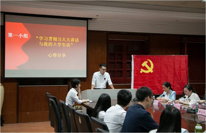 第一学习小组在前期集体研读交流习近平总书记重要讲话精神的基础上,推荐两位党员代表分享学习的心得体会。围绕习近平总书记对青年学生的期许,李成龙结合自己大学四年的学习生活实践以及如何在优秀党员的带动下不断向党组织靠拢的经历,表达了“勇立潮头,担当道义”的坚定志向。李思雨以“继往开来,自强不息”为主题,阐述了自己对习近平总书记关于“青年是标志时代的最灵敏的晴雨表,时代的责任赋予青年,时代的光荣属于青年”讲话中青年与国家关系的理解,表达了作为一名学生党员要坚定信念、牢记使命、勇于创新,为国家发展、民族振兴贡献力量的坚强决心。