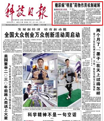 10月13日,《科技日报》头版报眼“最新发现与创新”栏目刊发题为“糖尿病‘明星’药物作用机制破解”的消息,报道我校生命科学学院林圣彩教授课题组在糖尿病治疗相关机制研究方面的最新成果。