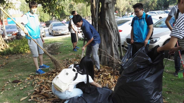 在活动现场,每支小队根据各自分派的任务片区进行作业,同学们或扫或夹,或捡或拾,全力清洁路面的落叶和因台风“莫兰蒂”导致的断枝和散落在草丛中的生活垃圾。所有清洁起来的垃圾用黑色塑料袋封装并堆放在统一位置。
