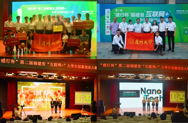 本次大赛分为创意组、成长组、初创组三个组别,我校共推荐18件作品参赛,其中16件从全省314件作品中脱颖而出,晋级决赛,全省共80件作品入围决赛。经过答辩评审,由萨本栋微米纳米科学技术研究院2015级博士生黄辉负责的纳米纤维滤材应用项目、软件学院2013级本科生李秀东负责的“i图”项目获得创意组金奖,奖金各4万元;物理科学与技术学院2014级硕士生梁添负责的桑德探地雷达项目、管理学院2013级本科生卢剑航负责的慕太基因检测项目、医学院2013级本科生付琳负责的“牙牙康”项目获得创意组银奖,医学院2015届博士毕业生王燊负责的弧形世界医疗科技项目、化学化工学院2015届博士毕业生王焱良负责的净屋环保科技项目获得初创组银奖,药学院2014届本科毕业生徐飞负责的“禾祥西新农业”项目、软件学院2016届本科毕业生李正强负责的“萌小助”项目获得成长组银奖,奖金各2万元;经济学院2014级本科生周静磊负责的慕思科技新型墙板项目、医学院2014级本科生陈漳鑫负责的“医宝贝”项目获得创意组铜奖,管理学院2014届硕士毕业生郭奇负责的“壹盏灯”项目、管理学院2014级本科生林宸负责的安提海拉健康卫士项目、航空航天学院2016届本科毕业生于凯负责的云上晴空无人机城市应急处理系统项目获得初创组铜奖,管理学院2014届本科毕业生钟阳镇负责的齐行旅行定制网项目、航空航天学院2013级本科生江建烽负责的“SDG新型斗齿”项目获得成长组铜奖,奖金各1万元。
