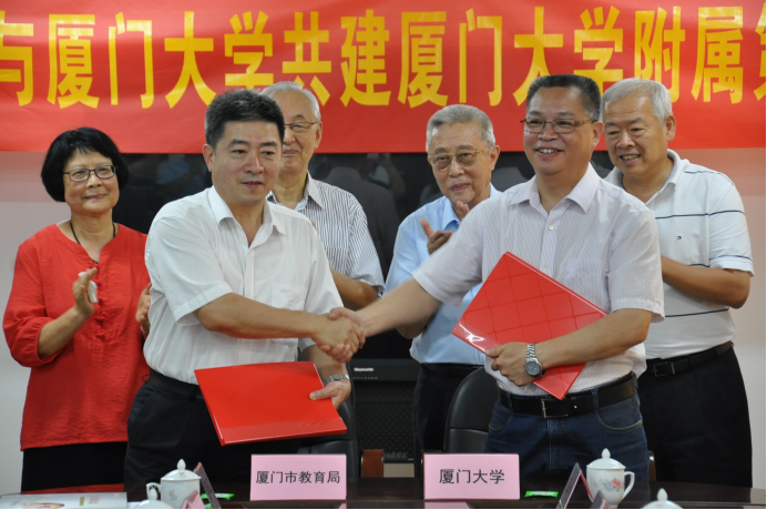 9月22日上午,厦门市教育局与厦门大学共建厦门大学附属第二中学签约暨挂牌仪式顺利举行,厦门市委教育工委书记、教育局局长赖菡和我校副校长叶世满正式签署共建协议,厦门大学附属第二中学的校牌正式启用,这宣告厦门二中正式成为了我校第六所附属学校。厦门市委常委、宣传部部长叶重耕,福建省人大原副主任洪华生,厦门市政协原主席蔡望怀,厦门大学原党委书记吴宣恭,厦门市教育局和我校有关部门负责人以及二中全体校领导、师生代表共同出席并见证了有关仪式。仪式由二中校长吴启建主持。