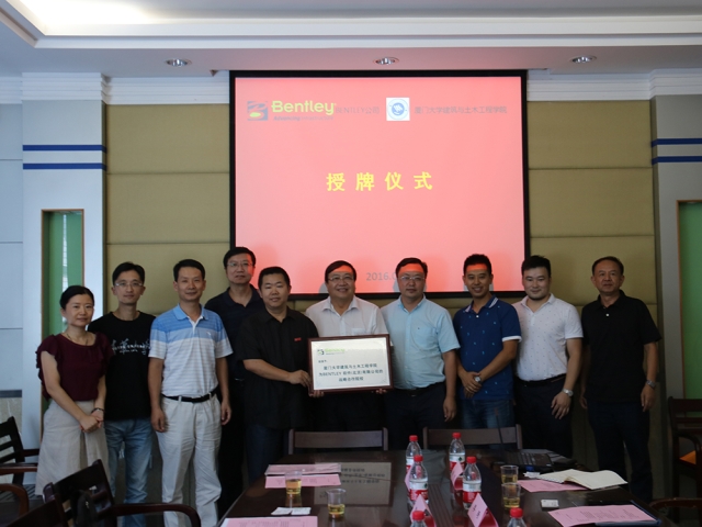Bentley软件公司全球副总裁刘德盛先生为厦门大学建筑与土木工程学院,授予Bentley公司与学院结成战略伙伴的证牌。