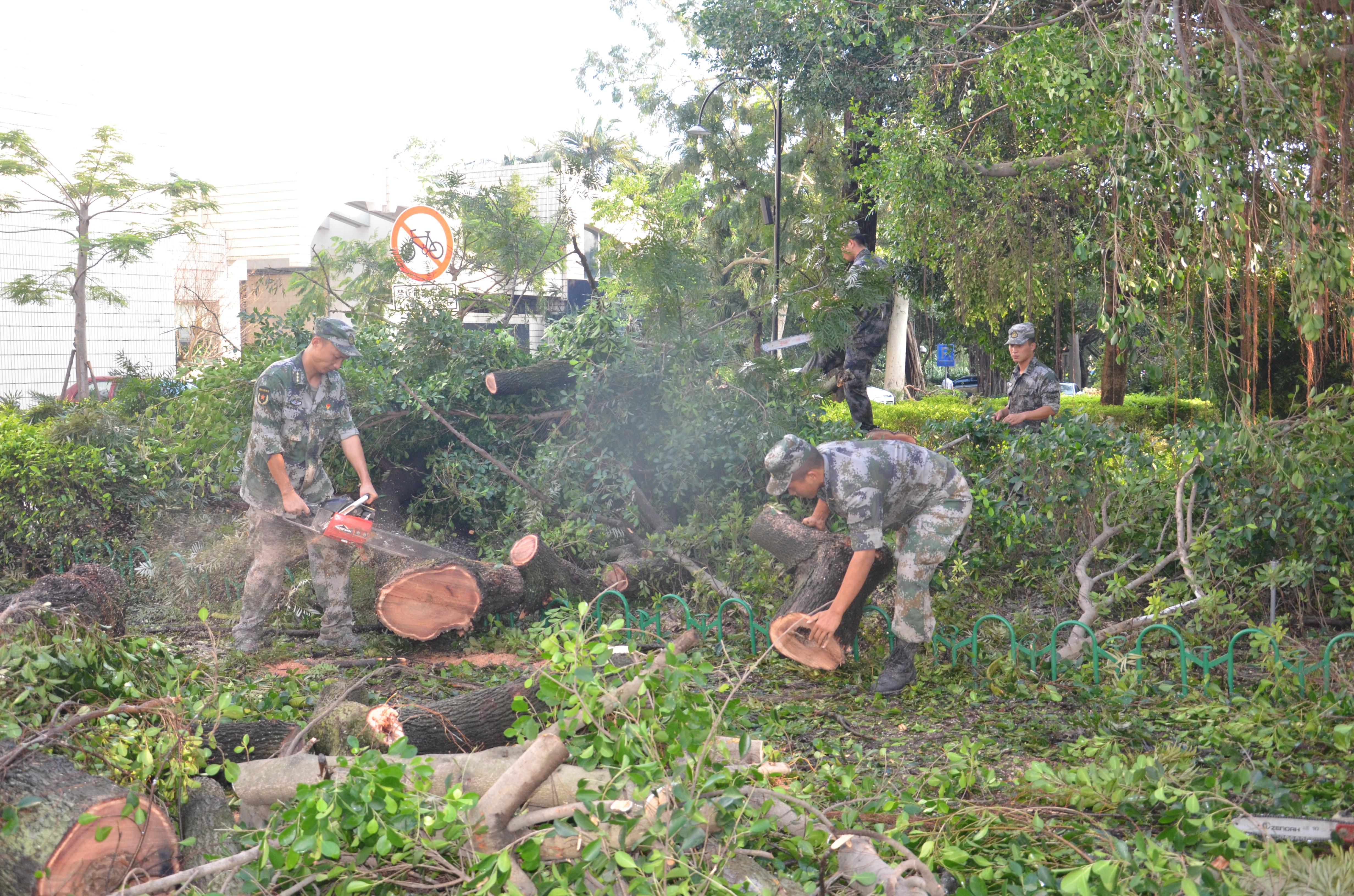 经过“莫兰蒂”狂风暴雨的洗礼之后,校内2万余棵树木遭受破坏,甚至一些树木被连根拔起,倒塌的树木,散落的树枝,严重影响了学校的交通运行。9月16日下午,厦门警备区派出具有丰富抢险经验的38名现役官兵携带装备、器材,支援我校道路清障工作。