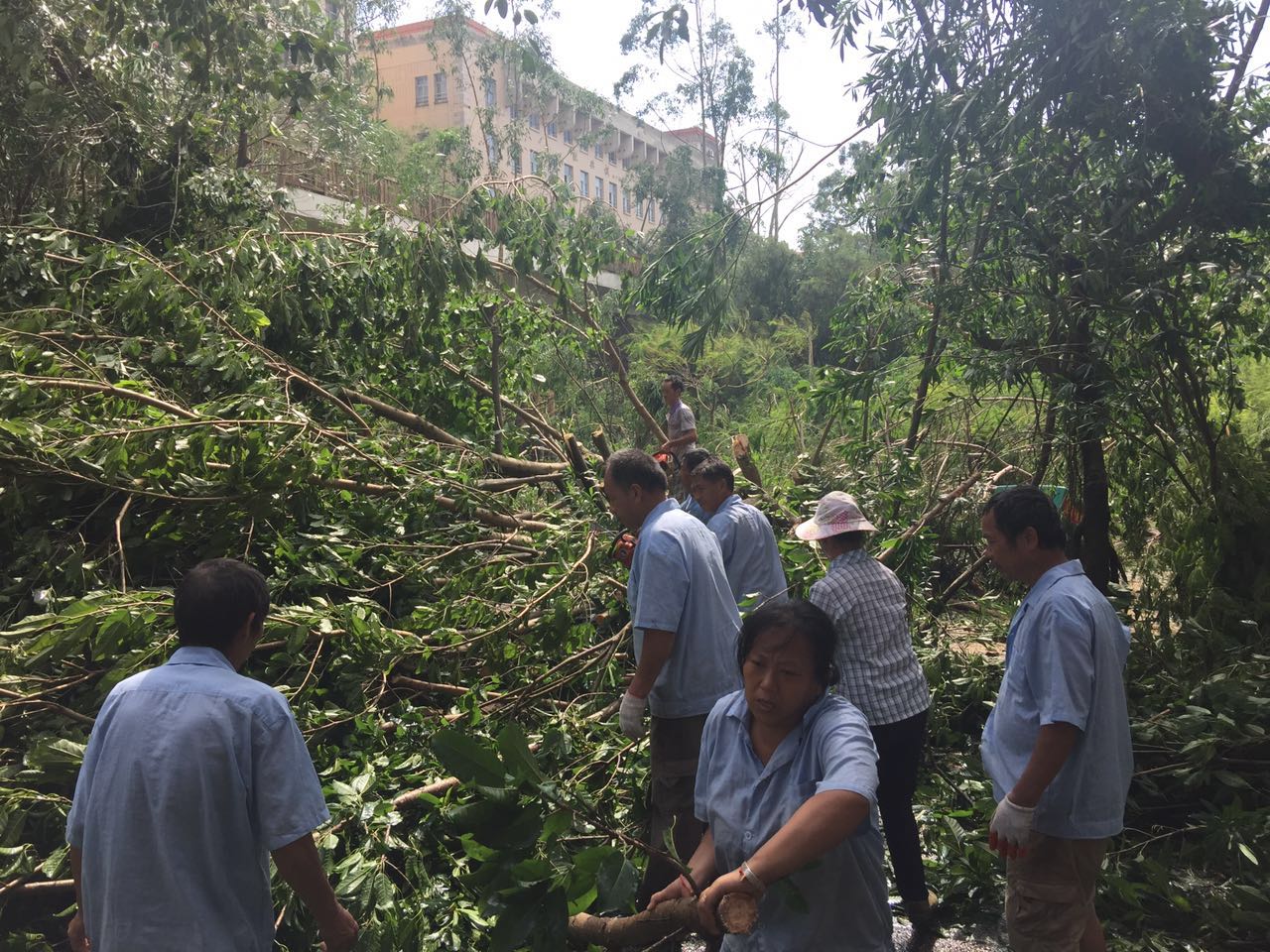 据了解,学校一共派出十几个小分队,负责清理台风过境后的校园道路。将近两天的劳动下来,目前群贤路、博学路、大南路、凌云路、凌峰路、海滨路、芙蓉路等学校的主干道已基本畅通,芙蓉等次干道也正在紧急清理中。