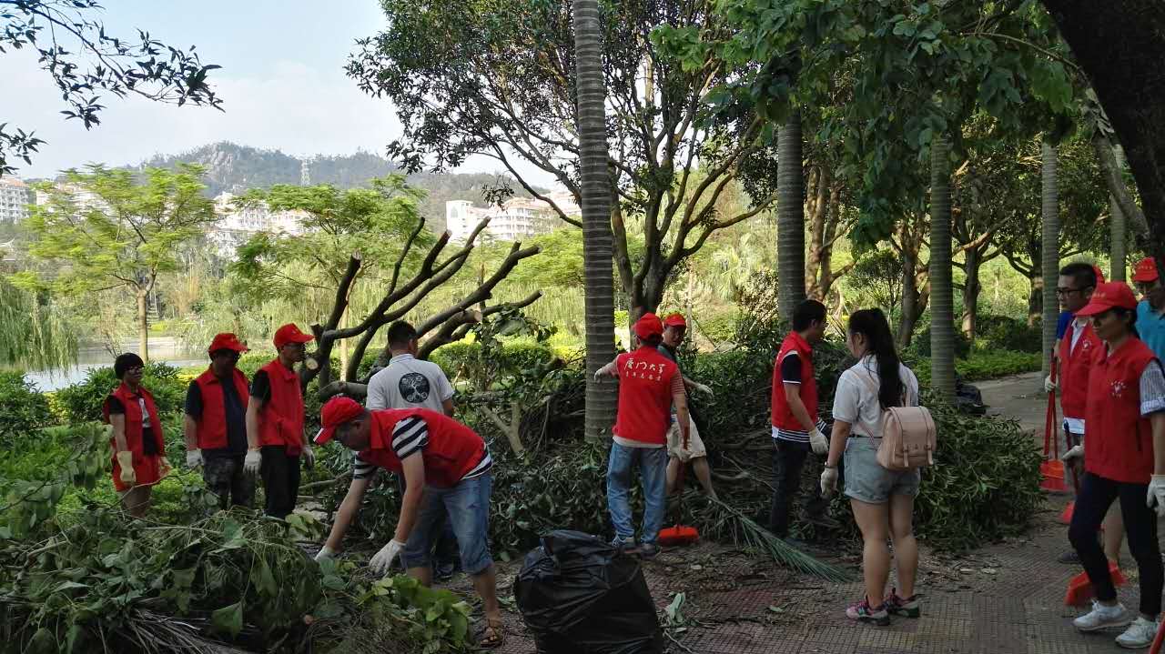 “现在要组建机关青年突击队,求附近志愿者加入,现在来颂恩楼220会议室集合。”15日中午11点多,台风过后的几个小时后,机关党委便在机关工作微信群中发出信息,号召青年教工加入学校灾后清障重建工作中。寥寥几句话,力量却无穷。信息发出后的两分钟,便有老师响应。随后,不断有人报名加入。短短1个小时内,近20名青年教师从各自家中赶来,组成机关青年突击队,帮助后勤部门一起清扫路面,搬除路障。16日,机关党委再次发出“机关青年突击队志愿者”招募令。17日下午14:00,一支身穿红色马甲的40多人的机关青年突击队又出现在嘉庚广场和芙蓉湖畔,进行路面及垃圾清理工作。