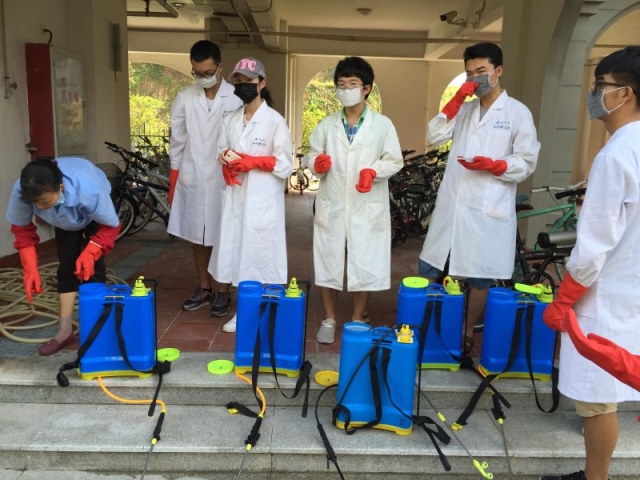 16日16:00,公共卫生学院近50名学生干部和本科新生等自发组成灾后重建志愿者队伍,一同到曾宪梓楼、国家工程中心清扫草坪杂物、擦净院楼玻璃、整理倒下的自行车,并协助后勤人员扶正周边倒下的树木等等。17日下午,学院组织14级学生在二期宿舍园区进行消杀工作,在下水道,楼梯,人流量大的区域进行喷洒药剂。发挥专业所长,修复校园环境。