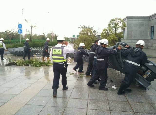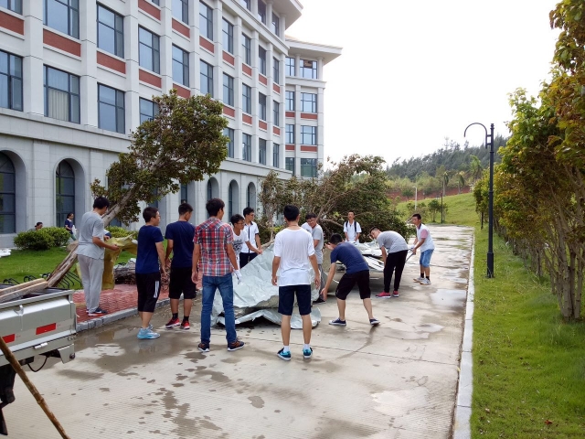 从台风预警至台风来袭,从台风来袭至灾后重建,保卫部门的叔叔阿姨一直坚守在岗位。台风来袭时,各个寝室区、教学区等楼里楼外的保安叔叔阿姨们为了保证学生的安全,彻夜不眠进行守卫。台风过境后,保安叔叔阿姨们也在自己工作时间之余立即投入灾后重建工作,在寝室区的每个楼层协助打扫风过所遗残骸等等。