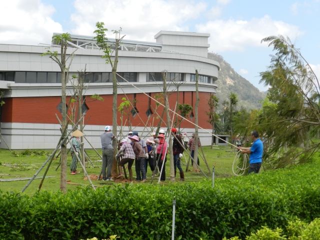 16日,由能源学院学生党员发起的35人志愿服务团队,配合管委会和物业人员,打扫路面、清除障碍、清理积水、收拾残余。短短半小时,学院三栋行政楼、实验楼周围便恢复了平日的干净整洁。其余党员则分散在各个宿舍楼,进行志愿打扫、重整工作,将党员团队的正能量散播到校园的每个角落。17日,组建党员支援服务突击队52名师生党员在翔安校区篮球场周边和能源学院周边区域开展拯救行动,经过一个上午的时间扶起倒下的芒果树和桂花树60余棵,在后勤人员的指导下进行重新种植、浇水。