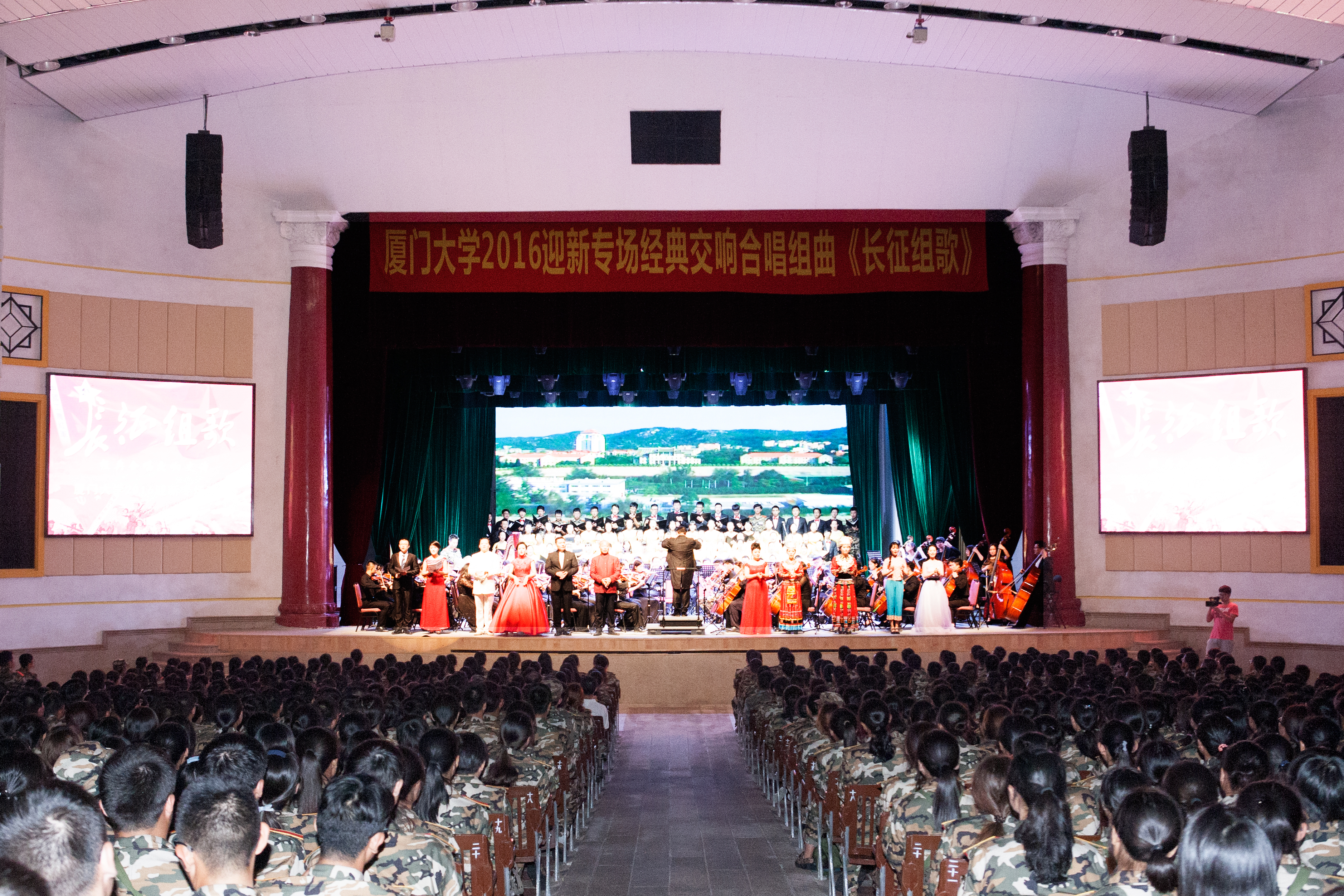 9月3日-4日晚,厦门大学2016年迎新专场经典交响合唱组曲《长征组歌》在建南大会堂连演两场。2016级全体本科新生随着台上师长和学长的演绎,共同走进历史深处,追忆八十年前的那段旷世传奇。校领导赖虹凯、林东伟到场观看。