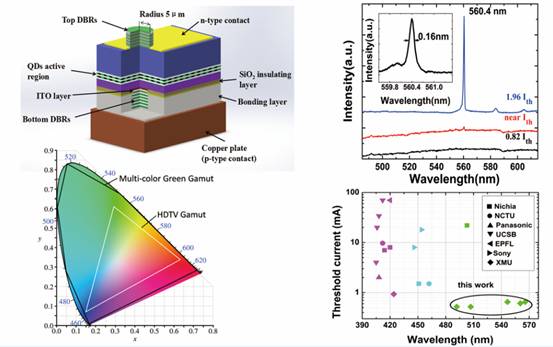 张保平教授课题组采用了由刘建平研究员课题组提供的新颖的InGaN量子点材料代替量子阱作为VCSEL有源发光区,并且引入了热导率很高的铜衬底,成功研制出室温下连续工作的绿光VCSEL。InGaN量子点材料有着量子限制斯塔克效应小、发光效率高、局域效应强等优点。通过优化谐振腔设计、减小腔内损耗、匹配光场与有源区的耦合,获得了目前波长最长的GaN基VCSEL并且具有极低的阈值电流密度。另外,通过调整VCSEL的谐振腔长度,成功实现了对VCSEL波长的调控,得到了492-565nm范围内的绿光激射,这对于广色域激光全色显示有着重大意义。