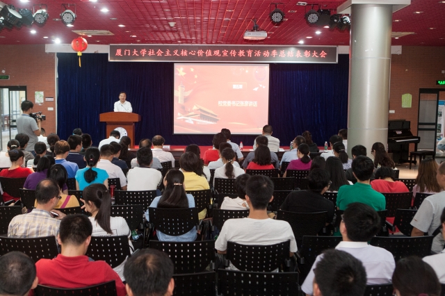 张彦代表学校对受表彰的集体和个人表示祝贺,并对活动的成功举办以及同学们的作品创意给予肯定。他强调,社会主义核心价值观,承载着整个国家和全社会的精神追求,体现着评判是非曲直的价值标准。社会主义核心价值观把涉及国家、社会、公民的价值要求融为一体,与国家发展、社会进步、个人成长息息相关。总结表彰是为了更好引导师生领会认同并积极践行社会主义核心价值观,推动“两学一做”学习教育深入开展。期待师生们能再思考、再研究、再创作,通过实实在在的小故事、小细节,使社会主义核心价值观宣传教育更加贴近师生,更容易为师生所理解和掌握,厦大师生要自觉成为社会主义核心价值观的宣传者、推动者和实践者。