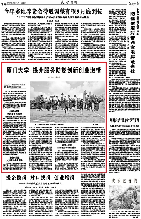7月20日,《经济日报》刊发题为“厦门大学:提升服务助燃创新创业激情”的深度通讯,大篇幅报道我校近年来助力学生就业创业的举措、经验和成效。