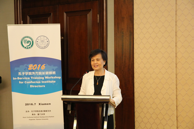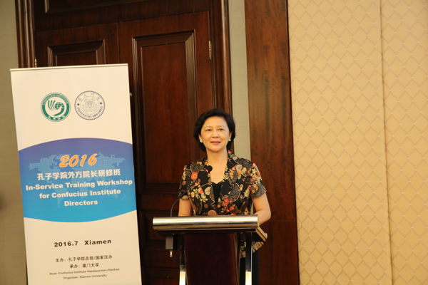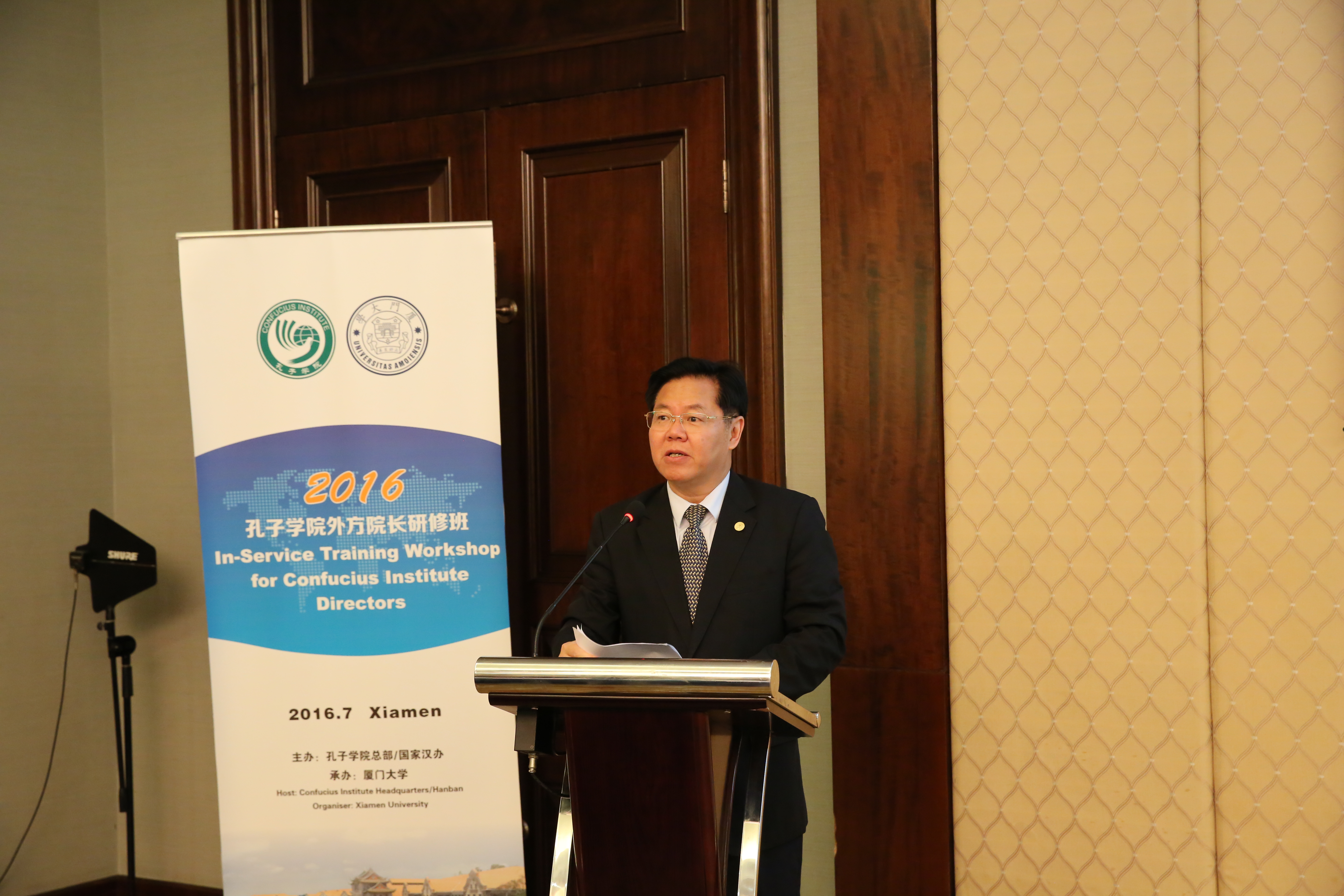 7月3日上午,由孔子学院总部/国家汉办主办,厦门大学承办的2016年第一期孔子学院外方院长研修班在厦门正式开班。出席此次研修班的领导有中国孔子学院总部总干事、国家汉办主任许琳,孔子学院总部副总干事、国家汉办副主任静炜,孔子学院总部特聘专家/高级顾问米歇尔·康·阿克曼,厦门大学校长朱崇实以及副校长詹心丽。