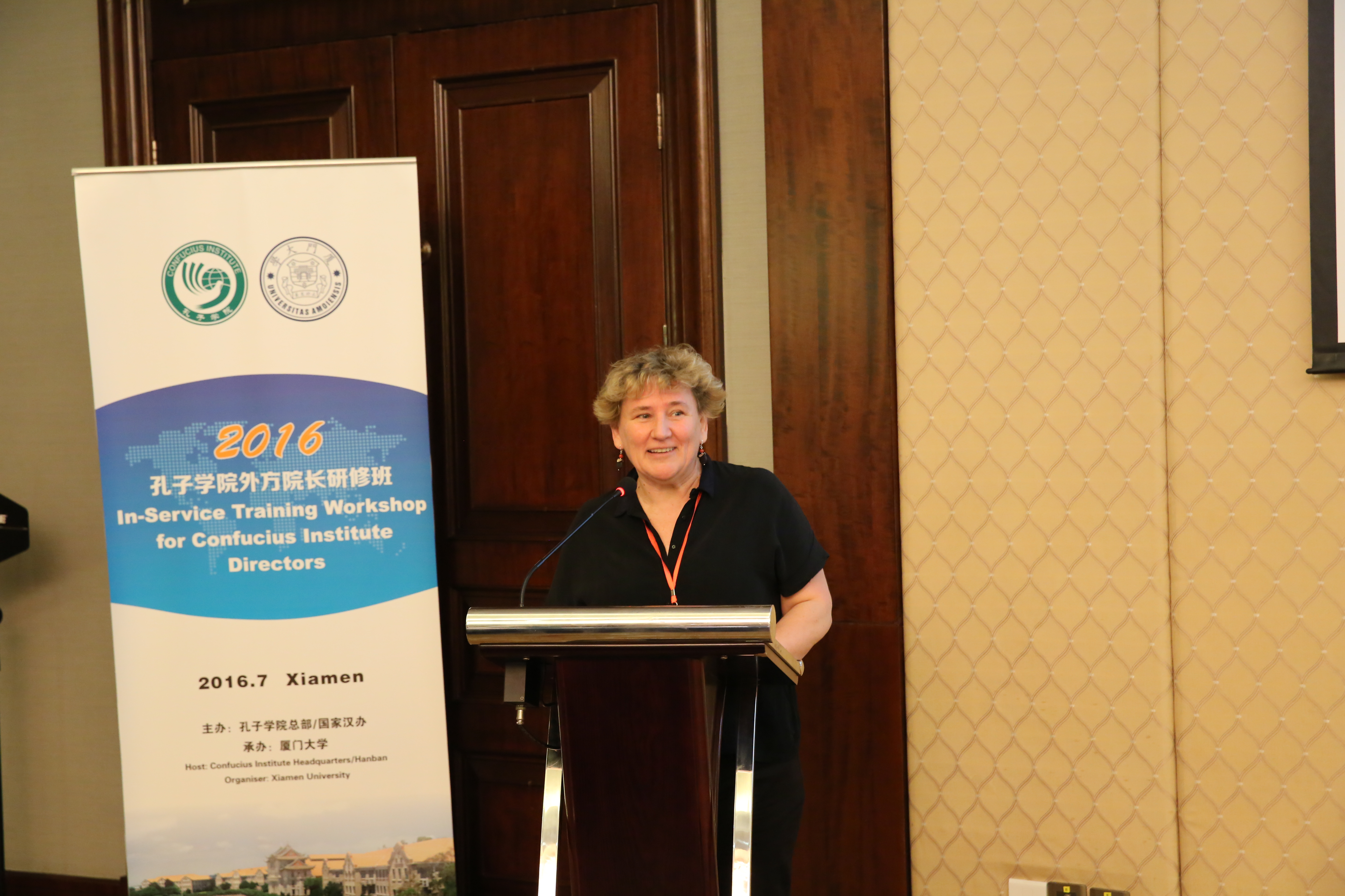 孔子学院总部总干事、国家汉办主任许琳女士作了发言,许主任回顾了孔子学院这些年在海外的发展状况和孔子学院在海外的主要工作内容:汉语教学,文化交流,深入学校和社区,建立与中国越来越广泛的联系。许主任随后介绍了厦门大学在对外交流学习方面的独特氛围和对孔子学院发展做出的突出贡献,并介绍了厦门大学即将建成的,坐落在厦门大学翔安校区的孔子学院院长学院,她希望新学院能够尽快建成并投入使用。最后,许主任介绍了汉办下一步的工作发展规划,并邀请各位孔子学院的院长对方案提出修改建议。许主任指出,此次研修班是新老孔子学院交流的一个重要机会,日程也丰富多彩,希望大家珍惜机会,多多交流。让许主任印象深刻的是,此次研修班的十多位外方院长可以用中文发言,中文听会,这在以往是很少见的,这也说明了这些年孔子学院取得的成绩,说明越来越多的外方院长与中国的联系越来越紧密。许主任生动有趣的发言,引得现场的院长们笑声阵阵,掌声不断。