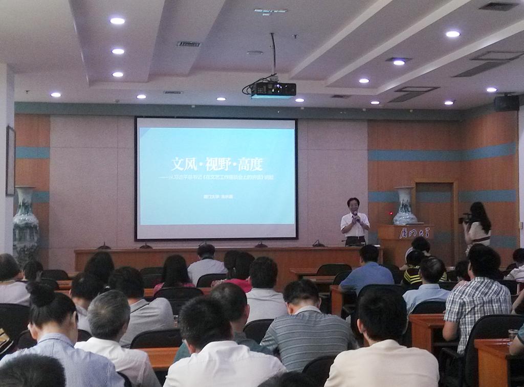 6月15日下午,第六期机关干部论坛在颂恩楼220报告厅举行。教师发展中心常务副主任、人文学院朱水涌教授做《文风 视野 高度——从习近平总书记在文艺工作座谈会上的讲话说起》的主题报告。论坛由机关党委副书记陈雪玲主持。