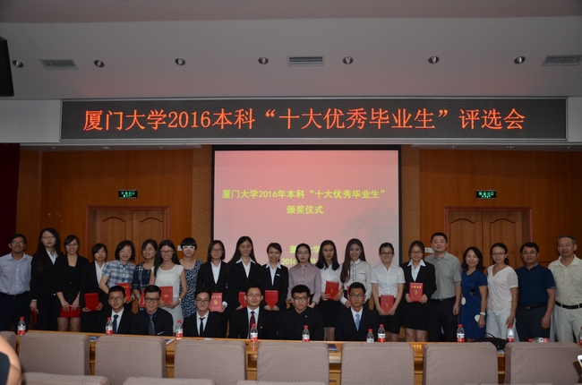 “十大优秀毕业生”评选工作于2016年3月启动,得到了广大师生的广泛关注和踊跃参与。经过学生申报、学院推荐、学校初评等阶段,共有20名同学成为“十大优秀毕业生”正式候选人。前期,学校通过厦大青春微信、厦大易班微信、易班网三个平台进行网络投票,吸引了三万九千多人参与。通过此次评选,充分展示了我校学子昂扬向上,奋发进取的精神风貌。