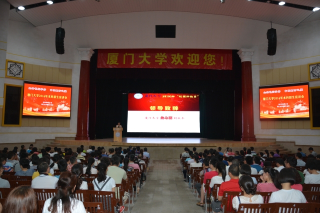 本次“校园开放日”,思明校区宣讲会邀请了厦门大学副校长、中国科学院院士、生命科学学院韩家淮教授,材料学院院长刘兴军教授,能源学院院长李宁教授;翔安校区宣讲会邀请了航空航天学院常务副院长尤延铖教授,海洋与地球学院院长助理陈明茹副教授分别介绍各院情况、学科优势和人才培养特色。招生办公室副主任余自中详细介绍厦门大学本科教学与人才培养特色,解读2016年厦门大学本科招生政策。宣讲会由招生办主任吴国瑛主持。