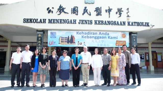 17日,詹心丽一行访问了八打灵公教国民型中学。八打灵公教中学是马来西亚八打灵再也的一所传统中学,常被称为国民型华文中学,是男女混合的公立学校。由吴酉俊修士于1956年创办,目前在校学生已超过3100人。詹心丽一行参观并了解了该校的办学历史和培养特色。招生办副主任余自中和分校招生专员萧尉文分别为中学师生介绍厦门大学厦门本部和厦门大学马来西亚分校的招生政策,海洋与地球院长助理陈明茹则简要介绍了“中国-东盟海洋学院的招生计划”。