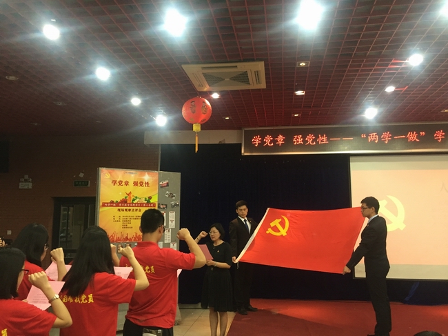 “像叶孤舟行在山丘,那样的为真理争斗,像他一样嫉恶如仇,像他一样不屑权谋”。一首《马克思是个90后》的说唱演出,瞬间炒热了现场的气氛。马克思与90后,看似风马牛不相及,却以如此流行文化的方式和90后的学生党员们相遇。演唱结束现场喊起了“学党章党规、学系列讲话,做合格党员,我们90后在行动”的口号,90后的学生党员们亮出了小清新、二次元的“回归马克思”潮流。此外,在党章知识连字互动、党员宣誓环节,通过让现场党员参与其中的形式,将原本较为枯燥的党章知识转变为丰富有趣的连字和抢答。而全体预备党员在院党委陈雪玲书记带领下庄严宣誓,是对预备党员最实际、最生动的党的观念的教育,也是预备党员进行自我教育的好形式。