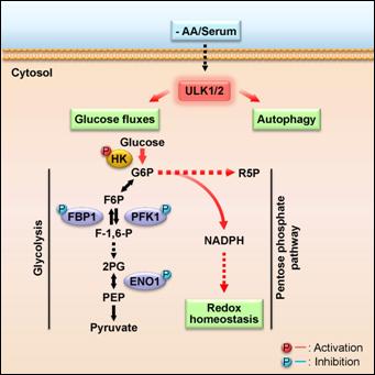 通过三年多的技术攻关,该研究小组发现,在氨基酸或血清缺乏的情况下,自噬启动激酶ULK1可以直接地磷酸化葡萄糖代谢通路中的多个关键酶,包括糖酵解途径中的己糖激酶(HK)、磷酸果糖激酶(PFK1)、烯醇化酶(ENO1)以及糖异生途径中的果糖-1,6-二磷酸酶(FBP1),这些酶被ULK1磷酸化修饰后,它们的酶催化活力可以发生不同程度的改变,即促进了HK的活性以及抑制了PFK1、ENO1和FBP1的活力。研究表明,这些酶在活力上的变化不仅可以最大限度地维持应激状态下的糖酵解速率,也可以使更高比例的糖代谢中间产物葡萄糖-6-磷酸(G6P)流向磷酸戊糖途径(PPP),从而在整体上维持细胞内的能量与氧化还原稳态。更进一步的研究发现,ULK1在葡萄糖代谢通路上的调控作用,是一种不依赖于其在经典的自噬方面的新功能。