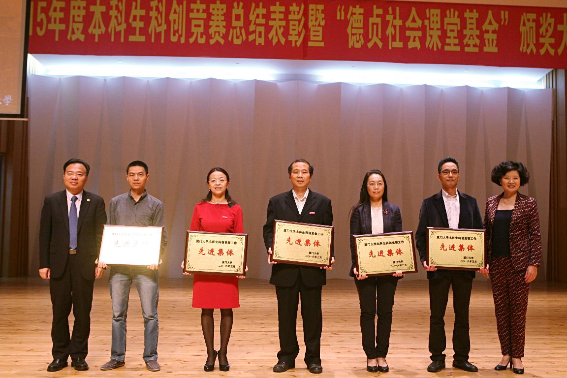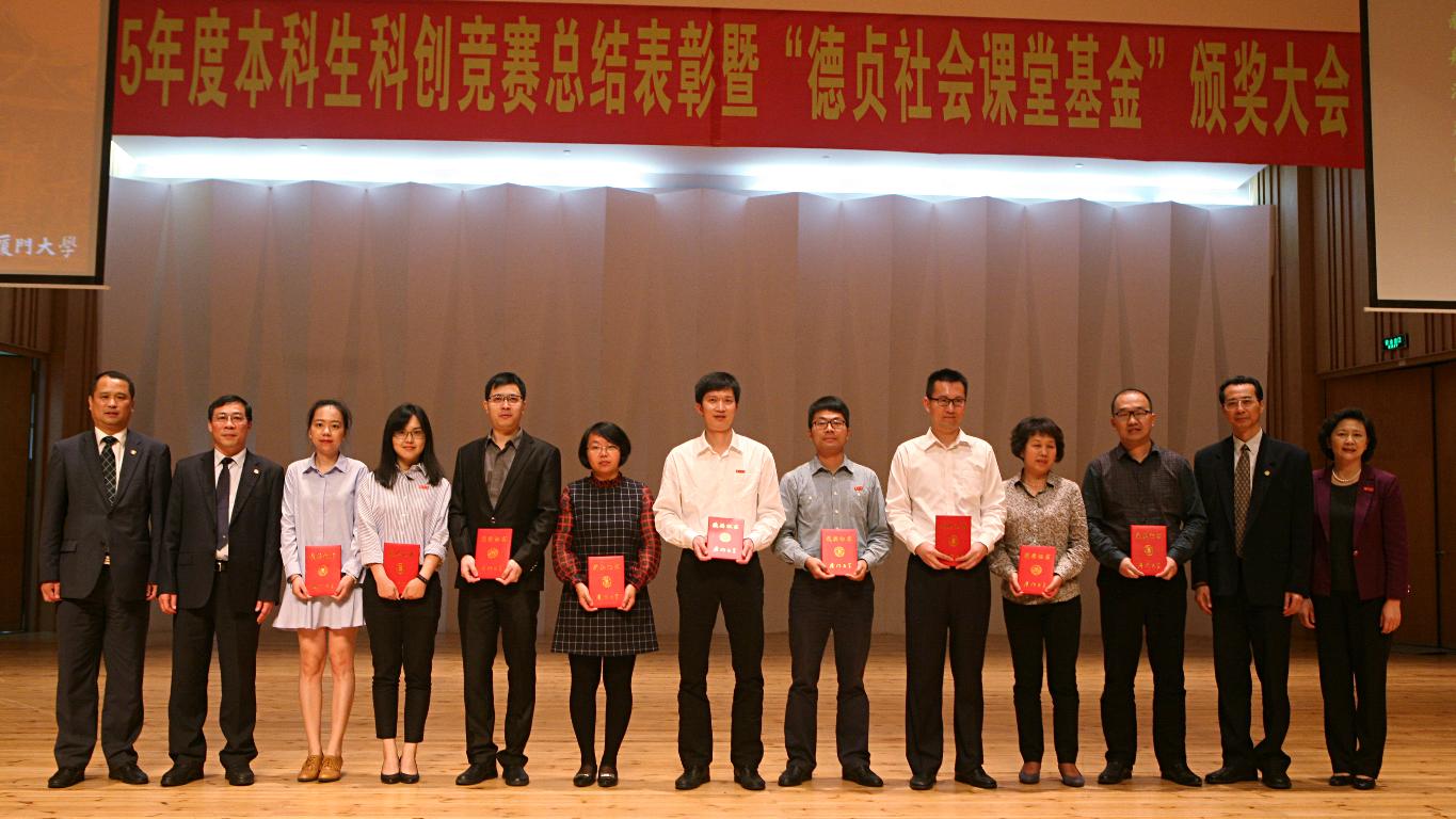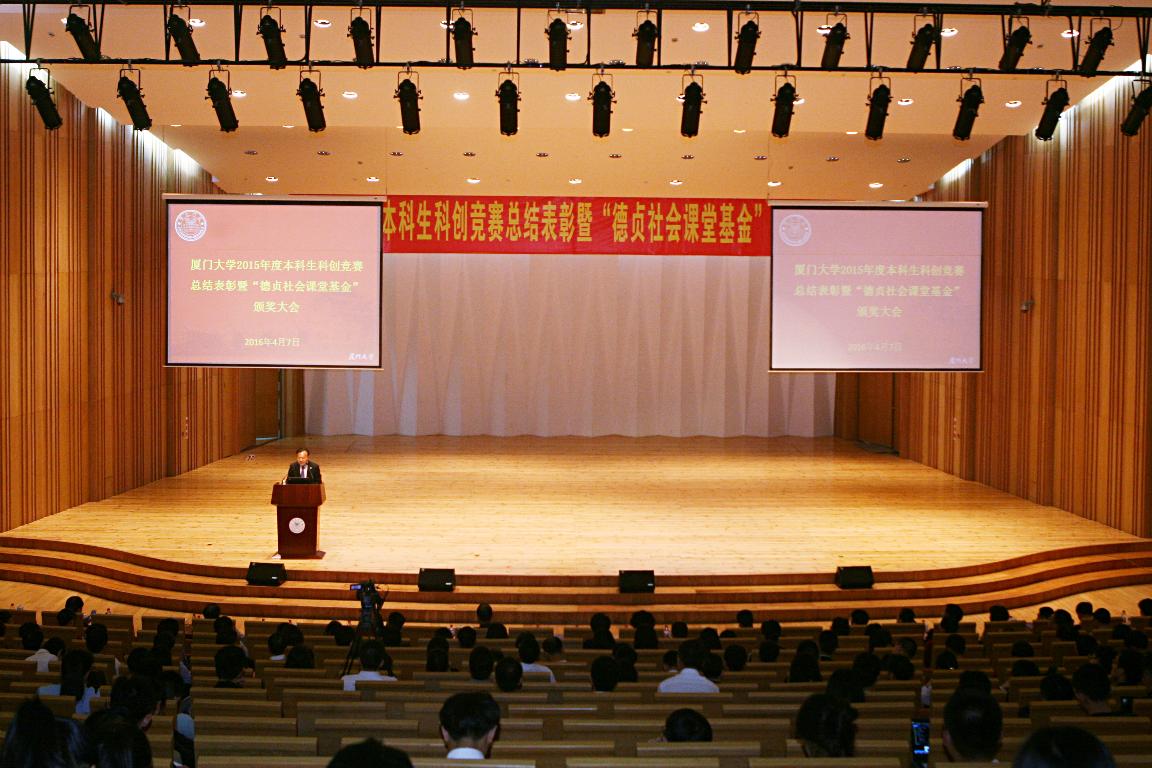 4月7日下午,在厦大迎来95周年华诞之际,2015年度本科生科创竞赛总结表彰大会暨“德贞社会课堂基金”颁奖大会在科学艺术中心隆重举行。大会总结了2015年度本科生科创竞赛工作,并对2015年度本科生优秀学业竞赛项目、优秀论文、先进个人、优秀指导教师、和先进集体进行表彰。