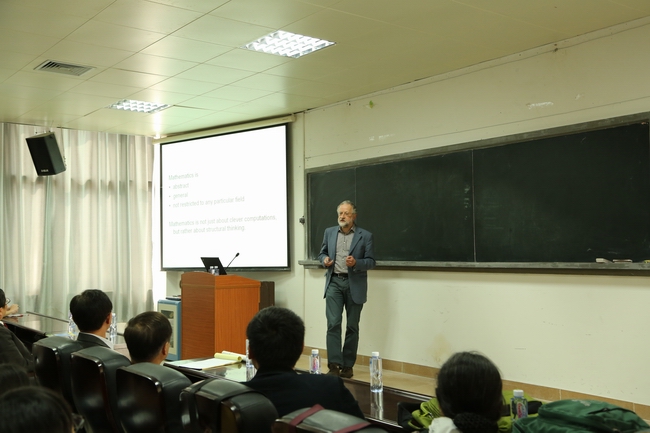 讲座中,Jürgen Jost教授用图片、动画与数学公式展示了数学在网络分析、机器人、建筑结构、人脸识别等方面的应用,使得学生更形象地领悟数学原理。Jürgen Jost教授指出,数学不仅仅是计算,更是一种结构思维,数学的抽象性和一般性,使得诸多不同的学科和技术领域变得统一。