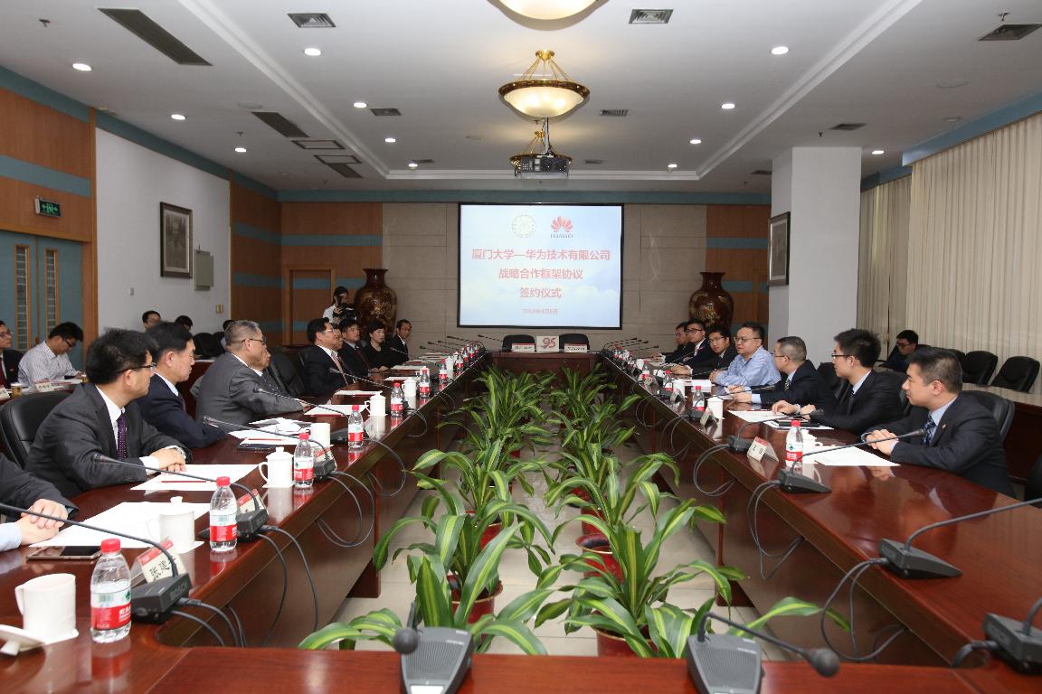 4月6日下午,在厦门大学建校95周年之日,我校与华为技术有限公司在颂恩楼215会议室签署战略合作框架协议。校长朱崇实、华为技术有限公司高级副总裁郑宝用,厦门市委常委、副市长林文生,中国科学院院士、我校化学化工学院田中群、厦门市政府副秘书长蔡伟中、华为福州企业业务部部长方国彬等出席签约仪式。我校副校长叶世满与华为福州代表处代表杨赛代表双方签约,签约仪式由厦门大学校长助理滕伯刚主持。