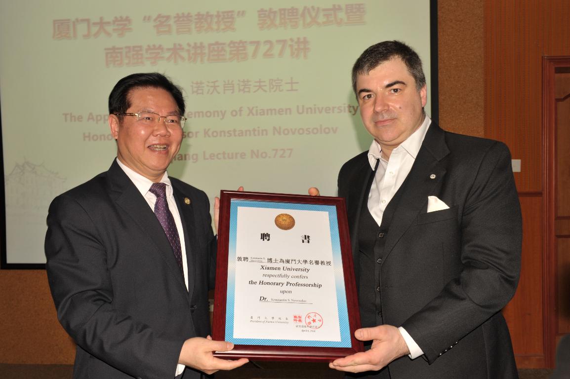 4月6日下午,我校敦聘诺贝尔物理学奖得主康斯坦丁•诺沃肖洛夫院士为名誉教授仪式在化学报告厅举行,化学化工学院院长江云宝教授主持仪式。江云宝院长对报告人康斯坦丁·诺沃肖洛夫院士进行介绍,对诺沃肖洛夫院士自2014年起为厦门大学在人才培养、科学研究、学科建设等方面所给予的大力支持和悉心指导进行了回顾和感谢。厦门大学朱崇实校长为诺沃肖洛夫院士颁发名誉教授聘任书,并佩戴校徽,同时颁发南强学术讲座纪念牌。诺沃肖洛夫院士表示厦门大学科研实力出众,能够来到厦门大学担任荣誉教授是他的荣幸,以后他将进一步在学生交流(联合培养)和科研合作等方面来促进厦门大学与英国曼彻斯特大学的合作。