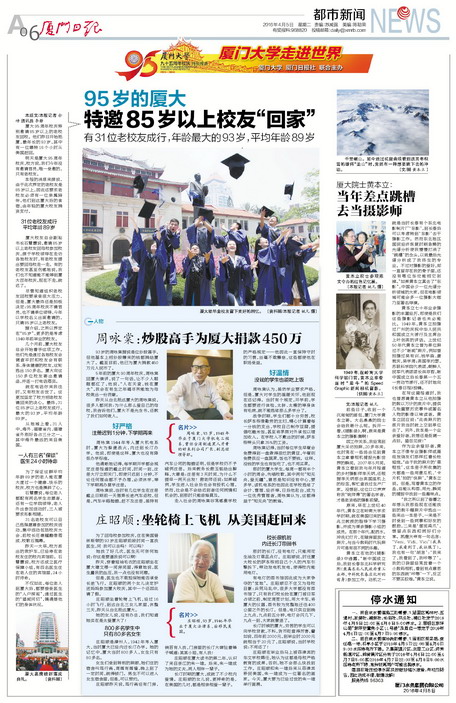 厦大95周年校庆特别邀请85岁以上的老校友回校。他们昨日开始抵厦,最年长的93岁,其中有一位辗转16个小时从美国赶回。