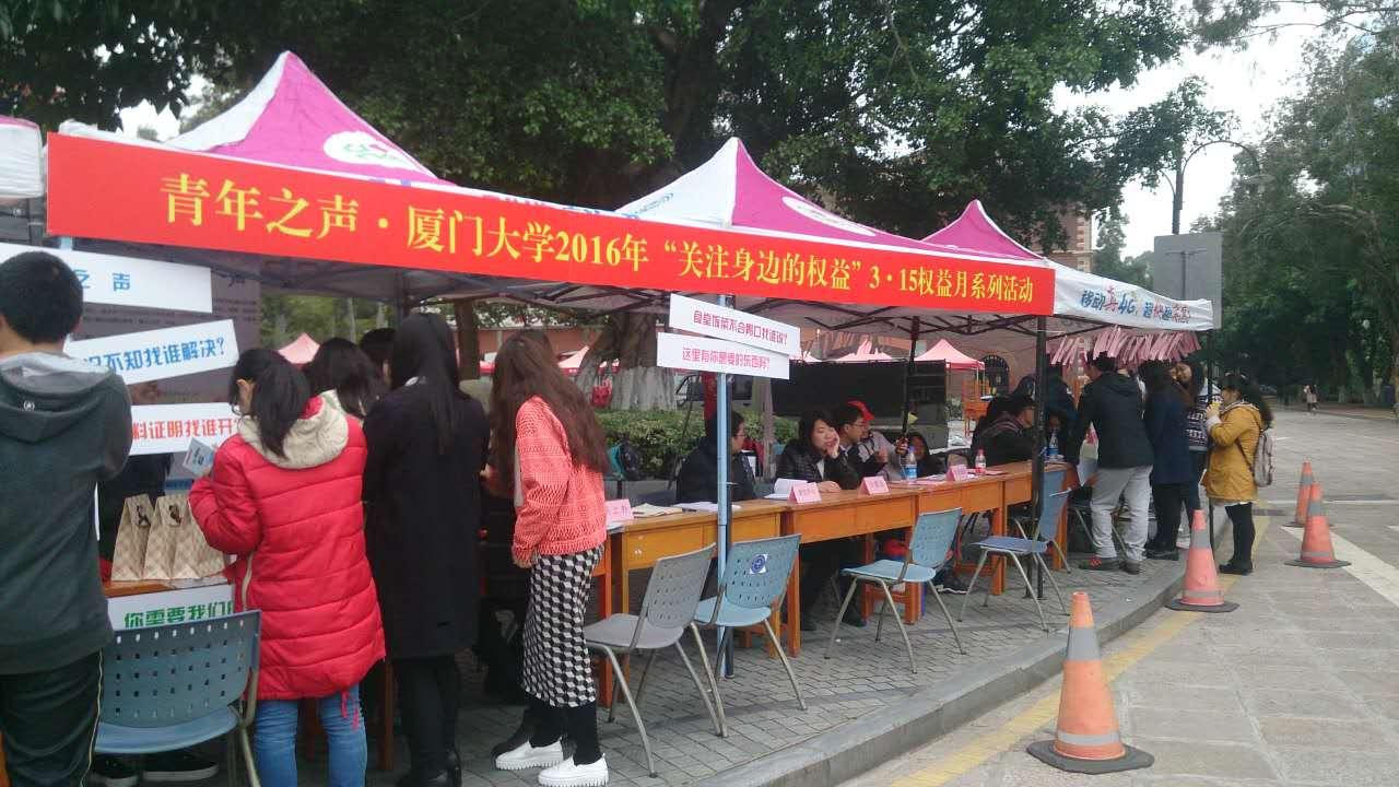 3月15日,“青年之声•厦门大学2016年‘关注身边的权益’3•15权益月系列活动”在我校三家村广场举行。此次活动由校团委主办,校学生会、校研究生会承办。