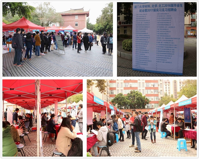3月11日上午,厦门大学材料、化学、化工及其相关专业2016届毕业生就业暨2017届实习见习招聘会于三家村学生广场成功举办。本次招聘会由厦门大学就业创业指导中心、材料学院和化学化工学院共同主办,为学生和用人单位提供了双向交流的机会。材料学院党委书记王康平、化学化工学院党委书记林辉、院长江云宝以及两院学工组全体老师悉数到场。