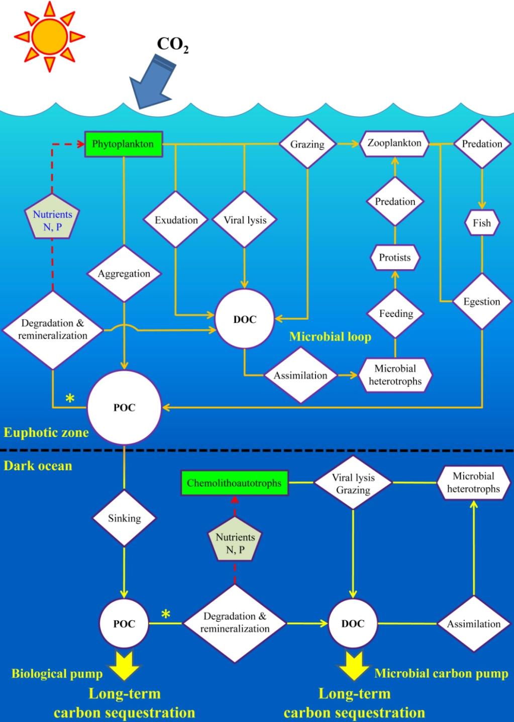 图1 . 海洋碳循环及附着微生物参与的关键过程和作用