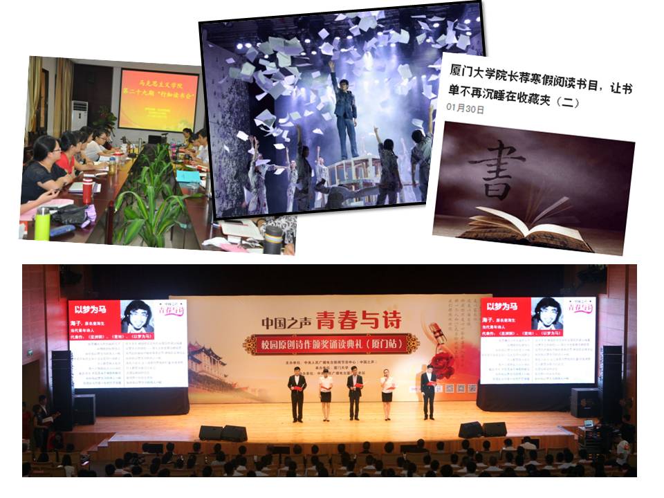 经典诵读、诗歌创作,是我校的优良传统,早在1980年,采贝诗社就邀请著名诗人舒婷担任顾问,定期开展诗歌创作、诗歌鉴赏等活动。近年来,学校整合诗歌诵读、诗歌书法、诗歌创作活动,举办“南强诗韵”诗歌大赛,让学生们和经典为友、与博览同行,在诗歌的熏陶中提升审美情趣、汲取创作营养。2015年10月份,厦大携手中央人民广播电台举办“青春与诗”校园原创诗作走进福建高校活动,点燃学生对诗歌的创作热情,所有诗作均为学生原创,内容以家为怀、以国为报,充满青春正能量。让诗意栖居学生的心灵,用诗歌教育和创作展现师生的文艺才华和创作潜力,也是我校对文化自信的一种畅快阐释。