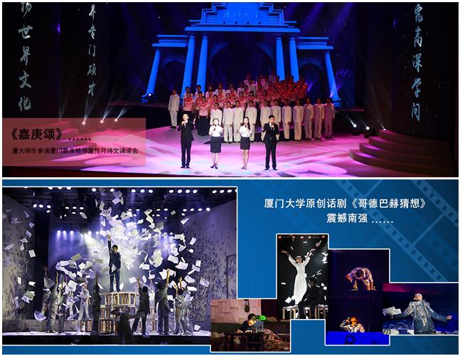 创作排演《陈嘉庚》、《南强颂》、《哥德巴赫猜想》等校本文艺作品,总结厦大精神文化,升华校史校训育人内涵。《哥德巴赫猜想》入选“共和国的脊梁——科学大师名校宣传工程”,并作为“共和国的脊梁”专题晚会参演节目登上人民大会堂。
