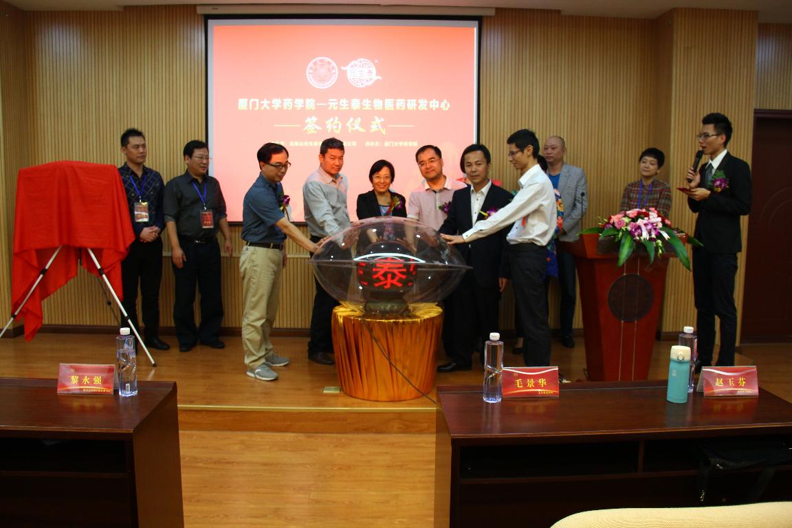 厦门大学药学院—元生泰生物医药研发中心由厦门大学药学院与武夷山元生泰生物科技有限公司合作创立,是自2012年双方共建武夷山教学实习基地后,校企合作的再次升级。中心初期计划投资一百万元,将以中药材药理成分研究和新制剂开发为重点合作方向,推动灵芝等中药材价值再发现,为人类健康事业做出新的贡献。目前中心首个“武夷灵芝系列产品的深度开发项目”已经展开,未来该项目将转化为新产品面向市场。