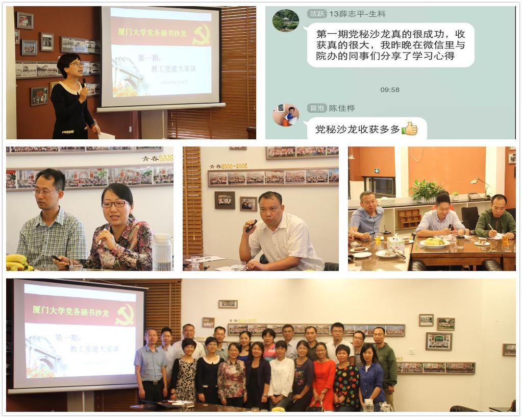 据悉,校党委组织部按照新时期高校党建工作新要求,深入践行“三严三实”,切实加强党务秘书队伍建设,以厦门大学党务秘书沙龙为载体,为党务秘书打造一个开放性、研究型的交流平台,引导党务秘书积极研修理论、努力提高业务、相互交流经验、共享党建成果,推动党务秘书队伍专业化、精致化发展。本期沙龙由化学化工学院、物理与机电工程学院、艺术学院、材料学院4个学院共同策划并承办,之后将继续采取校党委组织部指导下若干学院(单位)联合承办的方式常态化开展下去,切实把党务秘书沙龙自主学习交流、培训锻炼干部的作用落到实处。