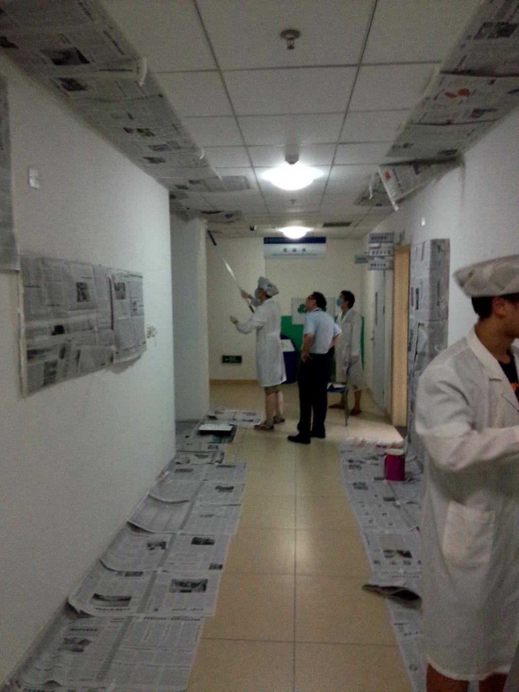午夜后,实验室停止了所有实验,同学们封闭好门窗,用报纸将污染区隔离,在墙面上均匀地喷洒一层除霉剂,片刻后用毛刷将霉菌菌丝擦除;为了防止仍有存活的孢子,静置一夜,使漂浮在空气中的孢子沉降下来,第二天他们再用消毒液浸泡过的拖布将台面和地面彻底清洁一遍;最后,为了彻底杜绝霉菌的滋生,用防霉涂料重新粉刷墙面。