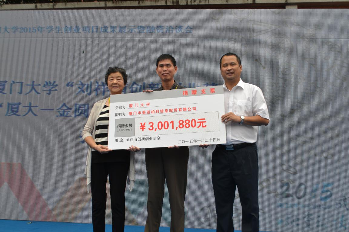 会上,厦门美亚柏科信息股份有限公司捐赠300.188万元设立“刘祥南创新创业基金”,每年拿出基金收益30万左右用于奖励在网络空间安全、创新创业方面表现突出的厦大学子。厦门金圆投资集团有限公司捐赠100万元设立“厦大—金圆大学生创新创业基金”,每年将基金收益约10万元用于奖励我校学生优秀创新创业团队。校党委副书记林东伟代表学校接受捐赠并向捐赠方颁发了捐赠证书。