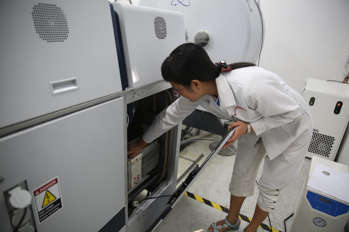 下午2:45,“大家伙”出了点小状况,不知什么原因,溶液入口堵塞。林老师赶紧用小扳手卸下螺丝,再用特制丝线一点点疏通。林老师笑着说,这其实并不常见,因为这仪器实在太“精贵”,随便一个配件就十万以上,而且懂维修超导磁场故障的工程师屈指可数,维修等待周期很长。因此,自己平时会特别小心地维护。即便如此,也难免有一些小故障,比如送样品途中的一粒微尘就可能导致堵塞。但因为与“大家伙”相伴这些年,积累丰富经验,一般性突发状况她都能及时处理,她自豪地向记者介绍:“全国同类型仪器并不多,能持续正常运行的就更少。而我们的这台,很少因故障停机!这也要得益于我处在一个很好的平台,有一个很好的后勤维修团队!”