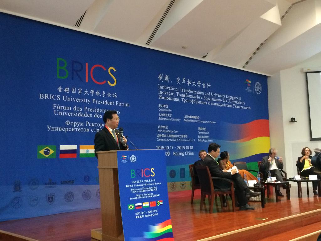 17日上午,论坛开幕式在北师大英东学术会堂举行。中国教育部部长袁贵仁、巴西、俄罗斯、印度等国驻华大使,南非驻华公使等出席开幕式并致辞,联合国教科文组织总干事伊琳娜•博科娃女士和金砖国家新开发银行行长卡马特先生分别为论坛发来贺信,开幕式还邀请了中远集团董事长、金砖国家工商理事会中方主席马泽华、南非国会议员、前总统曼德拉之孙恩科西•曼德拉做主旨演讲。在随后进行的大学校长圆桌会议上,朱校长和南非开普敦大学、巴西南大河州联邦大学、印度南亚大学、莫斯科国立大学等知名大学的校长先后做主旨发言。