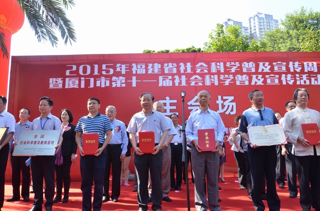 开幕式上,福建省社科联表彰了一批社会科学普及先进单位、作品和个人。我校经济学院教授许经勇、南洋研究院教授李金明获“福建省社会科学普及名家”,厦大文化讲堂被评为“福建省十佳社会讲坛”,我校社科处处长陈武元获“全国优秀社会科学普及工作者”称号。