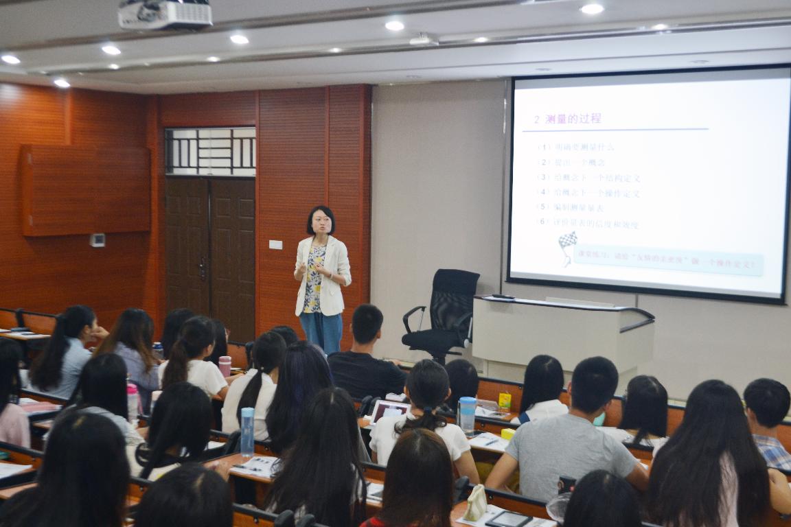 10点整,小白老师收拾好手边的东西,径直朝教室走去。随后的90分钟,小白老师围绕“市场调研中的测量”这一主题,开始了两节课的讲授。在她的课堂上,有测量的定义、维度等理论性讲解,也有“请给友情亲密度下一个操作定义”、“什么样的期末测试是一次信度和效度俱佳的考试”这样鲜活的例子。在场的学生分组讨论,再上台交流,她做点评。一时间,气氛活跃得很,她问一句,学生就七嘴八舌地答着,时而还有反驳,不过,小白老师都以幽默回应化解,课堂里充满着轻松活泼的氛围。