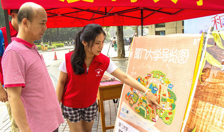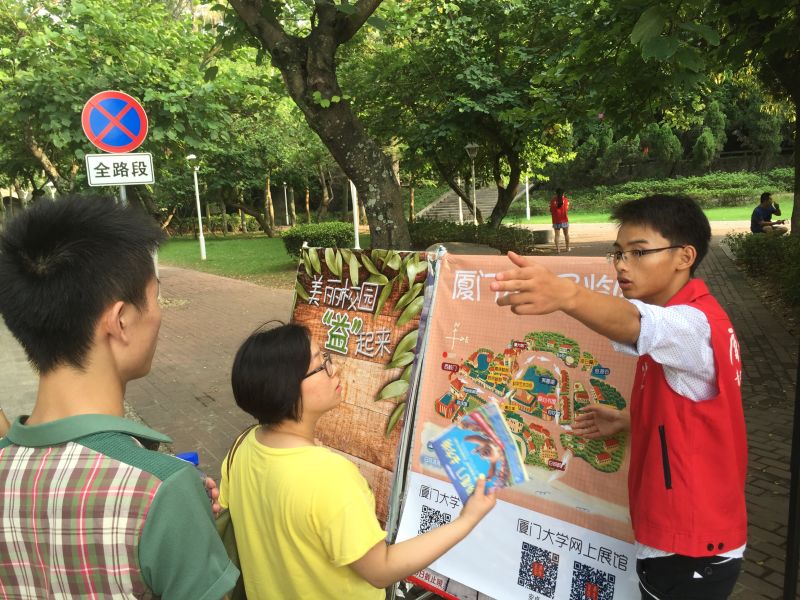 10月1日一早,西校门、大南校门、科艺中心和三家村的志愿服务站就投入了运行,同学们按照精心准备的厦门大学导览图,积极向游客介绍厦大,引导游客关注“厦门大学”官方微信,动员游客到校史馆看一看,进一步了解厦门大学的办学历程,从更深层次理解“中国最美丽校园”。志愿者还劝导游客文明参观校园,做到垃圾不落地,自觉清理餐盘。在志愿者的推介下,许多游客参与“一捡美”微公益活动中,随手捡起散落在路上的垃圾。截止发稿时,已有1700多个家庭参与到了“一捡美”志愿服务中。