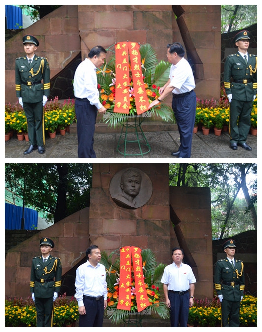 在庄严的罗扬才烈士雕像前,全体师生肃立,奏唱国歌,并向罗扬才烈士雕像三鞠躬。校党委书记张彦、校长朱崇实,代表学校向罗扬才烈士雕像敬献花篮。