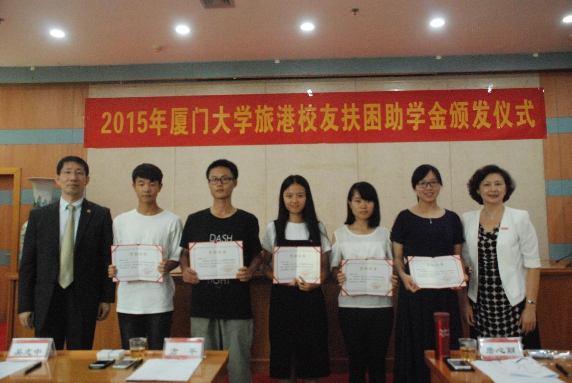 9月26日上午,2015年厦门大学旅港校友扶困助学金颁发仪式在思明校区嘉庚主楼220会议室举行。旅港校友会监事长、我校1978级计统系校友方平学长,旅港校友会副理事长、1972级经济系校友吴晋明学长,旅港校友会名誉会长兼财务部部长、1990级会计系校友黄欣琪学长,旅港校友会秘书长、1963级物理系校友王著恒学长,1990级电子工程系校友张宇泓学长,2008级机电系校友、2008年旅港校友扶困助学金受助学生李智全学长,福建省老区建设促进会副秘书长吴志中先生,福建省老区建设促进会副处级秘书程丹女士,福建省老区建设促进会秘书张燕平女士,厦门大学副校长、校友总会副理事长詹心丽,学生工作处处长夏侯建兵,校友总会秘书处秘书长曾国斌出席了助学金颁发仪式并为受助学生颁发资助证书和助学金。夏侯建兵主持了仪式。