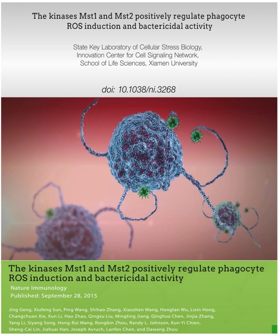 9月28日,生命科学学院周大旺教授与陈兰芬教授研究团队在Nature子刊《NatureImmunology》上在线发表题为“Kinases Mst1 and Mst2 positively regulatephagocytic induction of reactive oxygen species and bactericidal activity”的研究论文(Nature Immunology(2015)doi:10.1038/ni.3268)。
