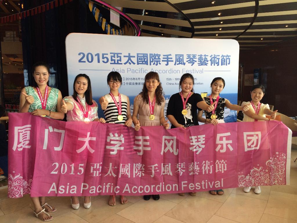 厦门大学艺术学院音乐系郑静雅教授指导的手风琴专业本科生及硕士研究生在 “2015 亚太国际手风琴艺术节”手风琴赛中喜获佳绩 。其中,厦大艺术学院荣获此次赛事的优秀组织奖;郑静雅老师荣获优秀指导教师奖;厦门大学手风琴乐团(12级本科生林秋瑜、13级艺术硕士生林白、13级本科交流生余胤璟、14级艺术硕士生张瑜芳等)荣获青年重奏合奏、青年乐团组金奖;14级研究生黄莹荣获成人组金奖。