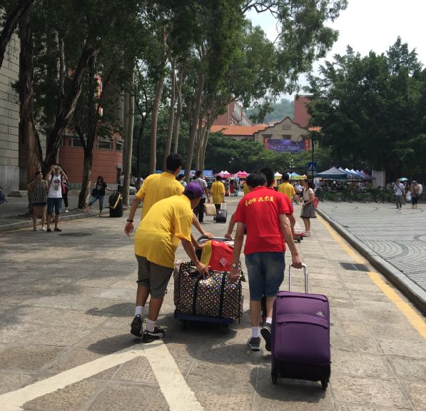 在新生报到现场,大多新生都是“组团”前来报到。来自湖北的2015级新生李同学的报到阵容可谓强大,一家六口全部到场,大大小小的行李六七件,堆成小山。“吃的、穿的、睡的,什么都有,爸爸妈妈恨不得将整个家都搬来。”李同学既无奈又好笑地说。