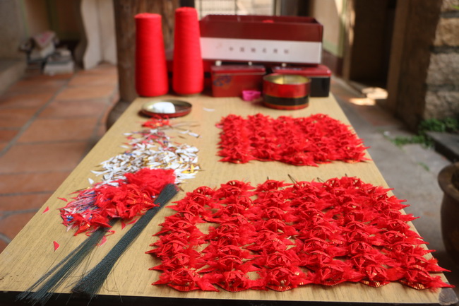 厦门市翔安区洪厝村有一座古宅院,里面的两辈妇女都可以巧手制作“春仔花”。洪厝扎花历史悠久,传承源于明清。春仔花是扎花的一个品种,以缝为主,缝扎结合,这种纸花多数是插在妇女头上的,概称“头花”。据传,在明嘉靖年间,祖籍洪厝的时任礼部侍郎洪朝选在元宵佳节回乡省亲带回京城进而流行的。经过几百年的传承和发展,现如今形成了春花、婆婆花、新娘花、普通花以及丧事花5种,佩戴方式也有区别。春仔花制作用的原材料精细而复杂,包括红线、小竹棍、金片、小铁丝等等。洪丽雅说,这些材料几乎都是就地取材。香烟盒、挂历染色后,裁剪成亮闪闪的花的叶片;用来缠绕的小铁丝,来自防蚊的纱窗,一根一根拆下来,比铝线硬度高,却和铝线一样细。两辈洪厝妇女就这样,边拉家常,边在天井里娴熟地飞针捻线,染纸细裁,从指尖传递出福气满满。